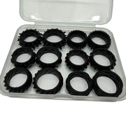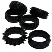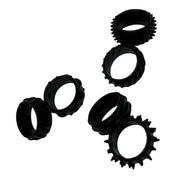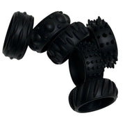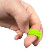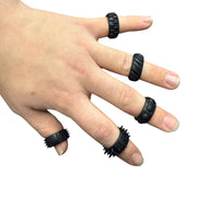 They are typically positioned on the upper segment of the finger or thumb, allowing for discreet tactile engagement and fidgeting. Each of the textured bands comes in two sizes. Designed include: Flexible soft spikes, small bristle like bumps, tyre tread, dots, lateral bumps and diagonal bumps.